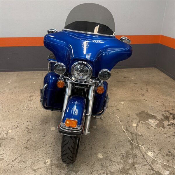 The 2010 Ultra Classic Electra Glide delivers a smooth, confident ride powered by the Twin Cam 96TM V-Twin engine paired with a six-speed Cruise Drive® transmission. Built for long-haul comfort, it comes standard with full touring amenities such as a Tour-Pak® luggage trunk, batwing fairing, and premium audio system. With its deep blue finish and classic chrome touches, this Electra Glide represents everything Harley-Davidson stands for—heritage, comfort, and adventure on the open road.