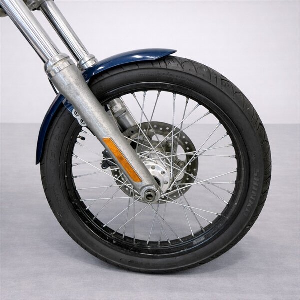 - Classic raked front end with wide drag-style handlebars