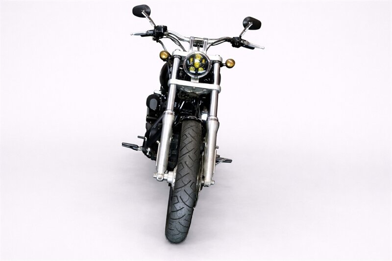 - Classic chopper styling with wide front forks and raked-out stance